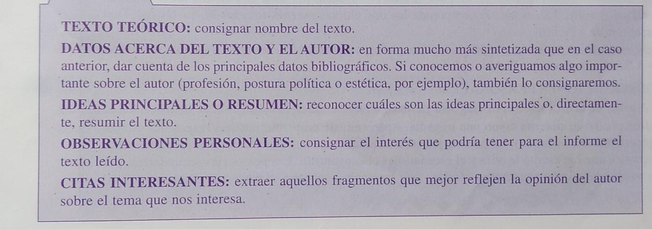 Escribir para la ficha el resumen de los textos teóricos con los que trabajen puede ser muy útil. Por un lado, así se obtiene un nuevo texto, más breve que el original y que se puede consultar sin necesidad de volver a este, por el otro, para escribir un resumen se requiere haber hecho una lectura minuciosa y comprensiva del texto.