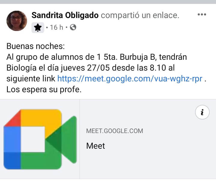 Chicos: este es el enlace a la clase por meet para el viernes, 21 de mayo, de 11:00 a 12:30. Los espero y recuerden que el miércoles les estaré dejando más material. Saludos cordiales!