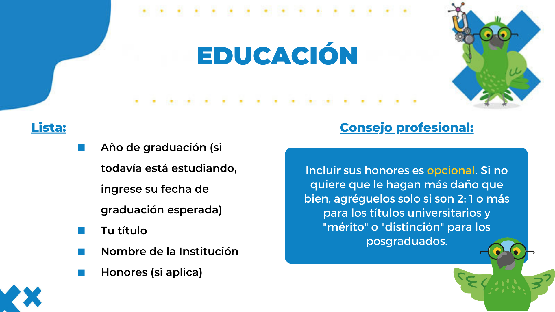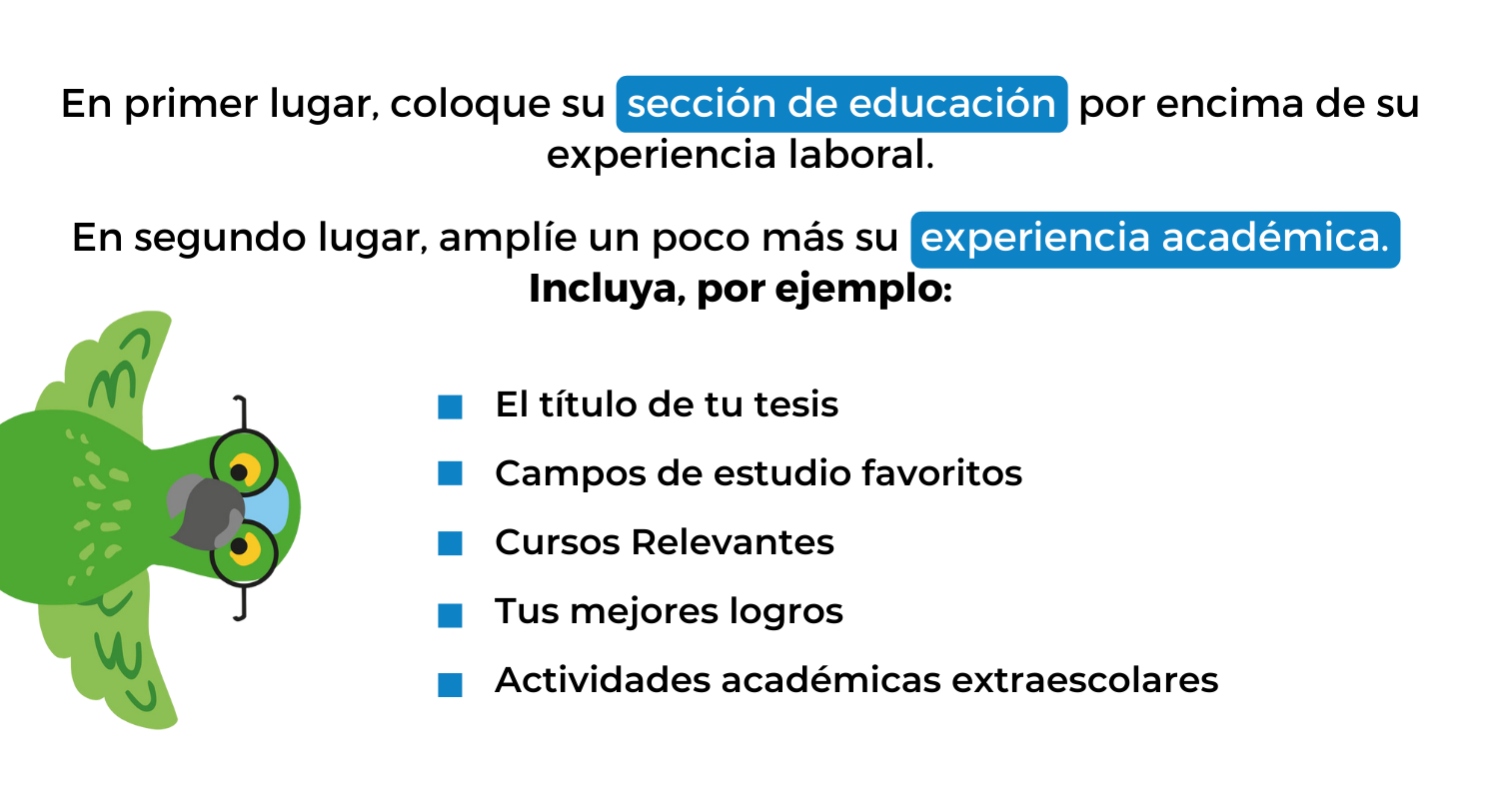 Si tienes estudios postsecundarios, inclúyelos solo en tu CV. No menciones tu escuela secundaria, a menos que sea tu grado más alto de educación.