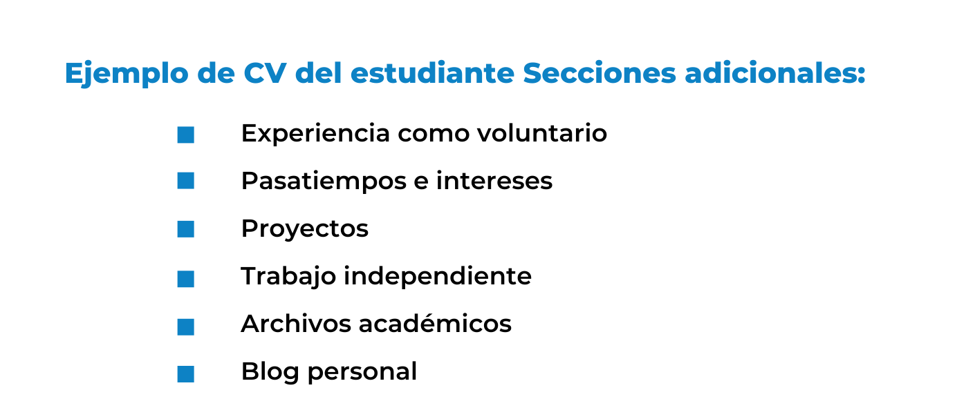 Un buen CV de estudiante aún se beneficiará de una sección adicional. Aquí tienes algunas ideas:
