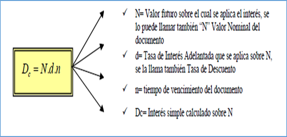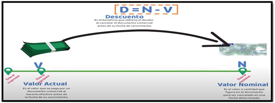 Podemos decir que se trata de situaciones en las cuales, por ejemplo, entregamos a terceros los documentos que tenemos por cobrar dentro de un cierto tiempo, recibiendo hoy a cambio una suma menor en concepto de valor presente o actual. La diferencia entre valor futuro expresado en los documentos y el importe que hoy recibimos por su canje es el interés que abonamos para poder contar con dinero disponible anticipadamente. En estos casos el interés total pagado recibe el nombre de “DESCUENTO”.