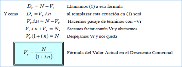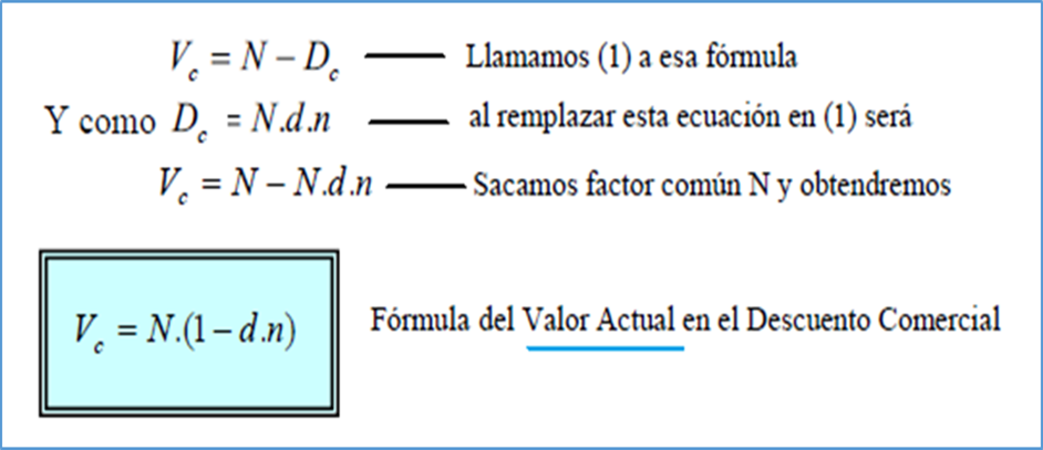 Si llamamos Vc al valor actual en el descuento comercial para no confundirlo con otros valores actuales podemos expresar:
