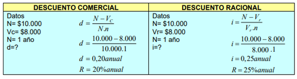 Esto implica que el valor actual que se obtiene según el descuento racional es siempre mayor que en el descuento comercial.
