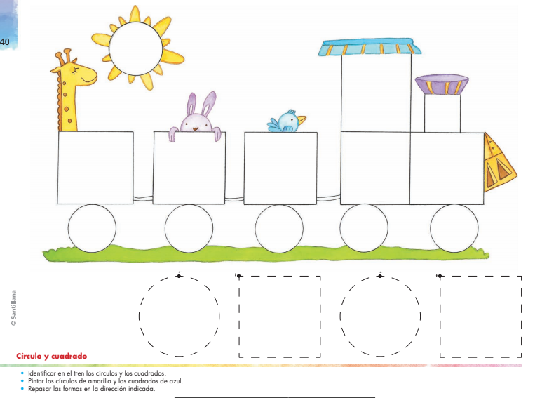 2- Pintar los círculos de amarillo y los cuadrados de azul