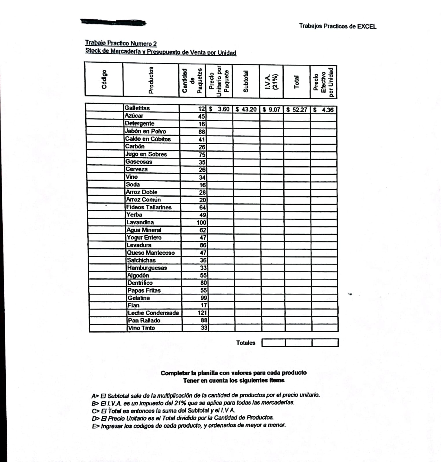 Resolver el ejercicio propuesto a continuación y guardarlo en un libro con el nombre EJERCICIO 1 + APELLIDO Y NOMBRE