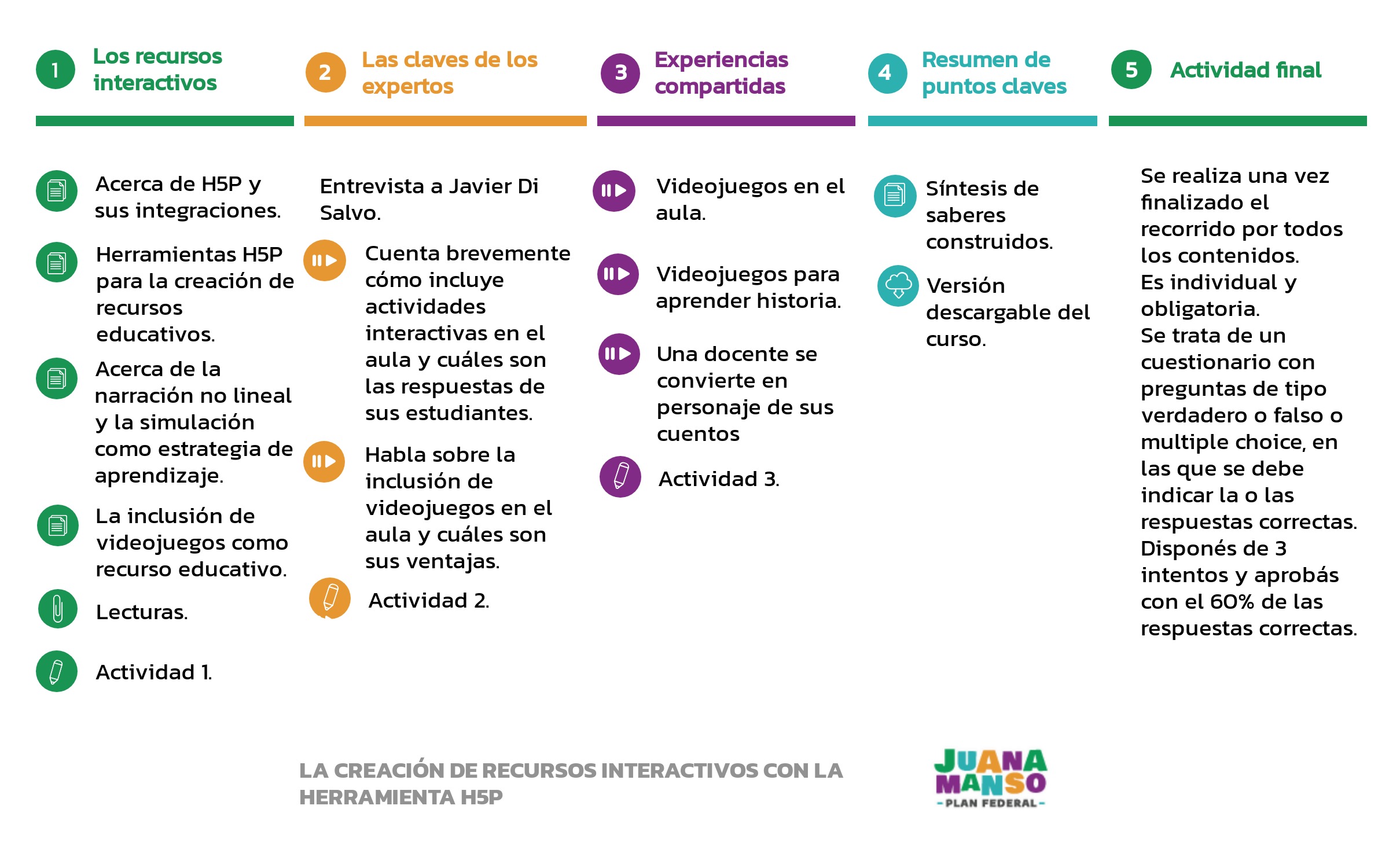Durante este curso vamos a indagar acerca de distintos objetos culturales que resultan valiosos para ser incorporados en nuestras propuestas educativas ya que presentan modos novedosos de construir conocimiento, de manera potente y significativa.En la Clase 1 abordaremos la creación de recursos interactivos con la herramienta h5p, la noción de narraciones no lineales y la inclusión de videojuegos en nuestras propuestas de enseñanza; en la Clase 2 completaremos este marco a través del aporte del Mg. Javier Di Salvo. En la Clase 3, revisaremos experiencias concretas para aplicar lo construido y, finalmente, realizaremos una revisión integral.