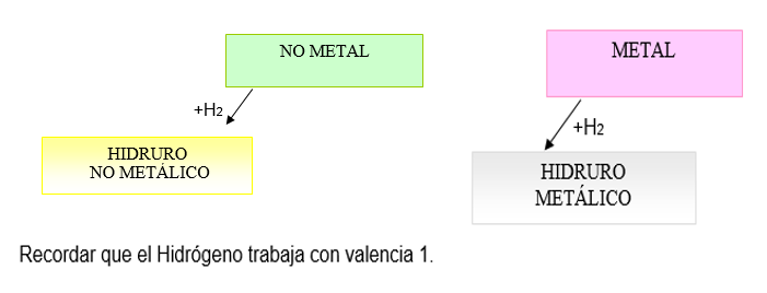 resultan de la combinación del Hidrogeno que trabaja con valencia 1 y forman hidruros Metálicos al combinarse con un METAL ; y al combinarse con un NO METAL forman Hidruros No Metalices