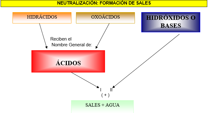 Cuando a una solución de un hidróxido, en la que se encuentran Cationes y Aniones OXHIDRILOS , se le añade una “Solución Ácida” que contiene PROTONES y ANIONES, se produce una Reacción Química en la que: el anión (OH)- del Hidróxido se une al Protón del Ácido formando una molécula de H2 O; y el “catión” del Hidróxido se une con el “anión” del ácido formando una SAL + H2O