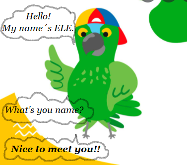 (mejorar la edición de esta imagen, ELE saluda, pregunta el nombre y dice la última frase de la burbuja)