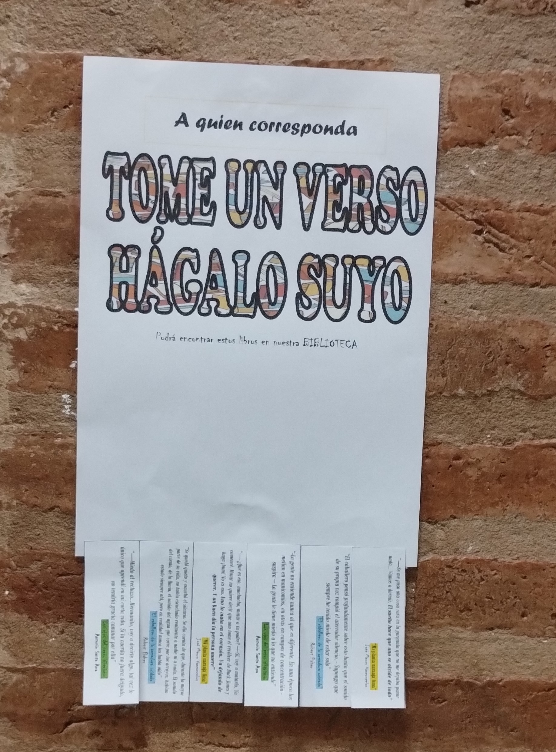 👉Ticket de lecturas: consistía en poner en distintos puntos del colegio una hoja con tickets que la comunidad podía cortar y llevárselo, las mismas poseían fragmentos de novelas que nuestra biblioteca tiene disponible.