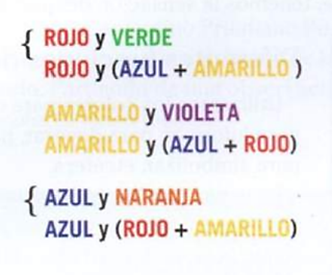 Los tres pares de complementarios más importantes son los que están formados por un color primario y un secundario formado por la mezcla de los otros dos primarios.