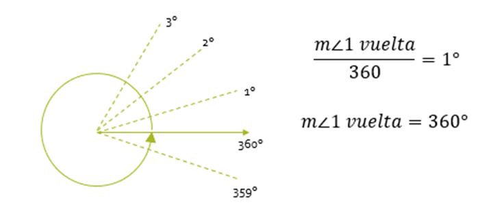 Tiene como unidad al grado sexagesimal (1°) que es el resultado de dividir el ángulo de una vuelta en 360 partes iguales.