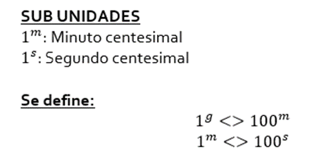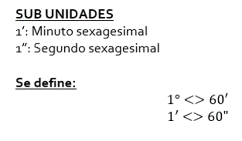 El grado sexagesimal, también se divide en subunidades (Las subunidades se usan para expresar las medidas de ángulos menores a un grado)