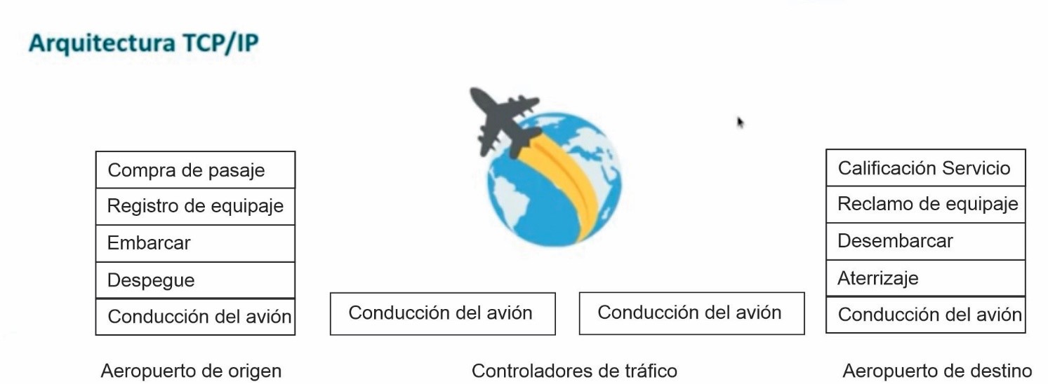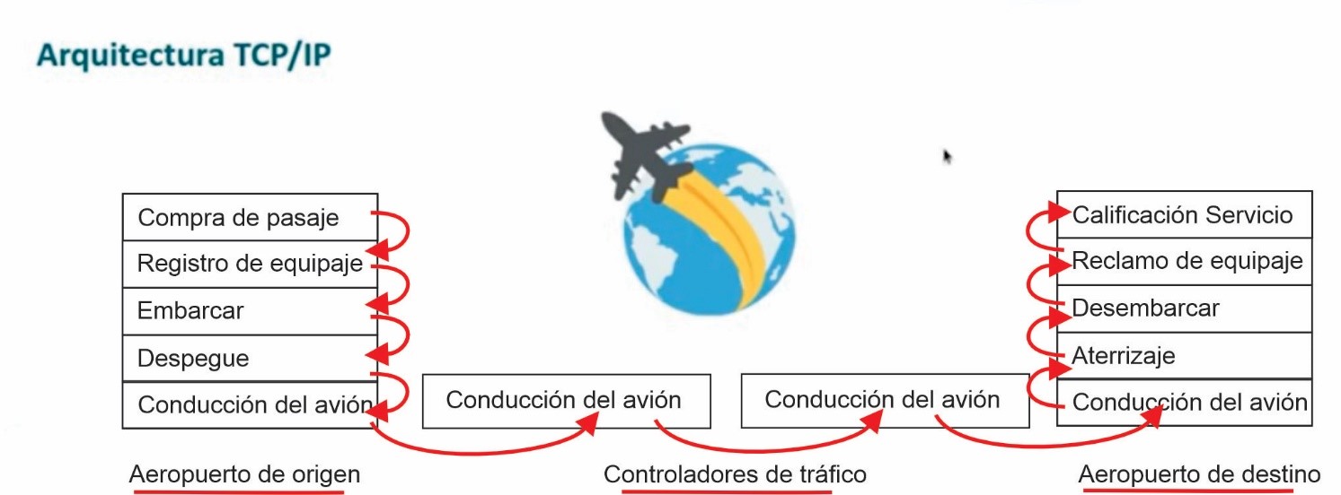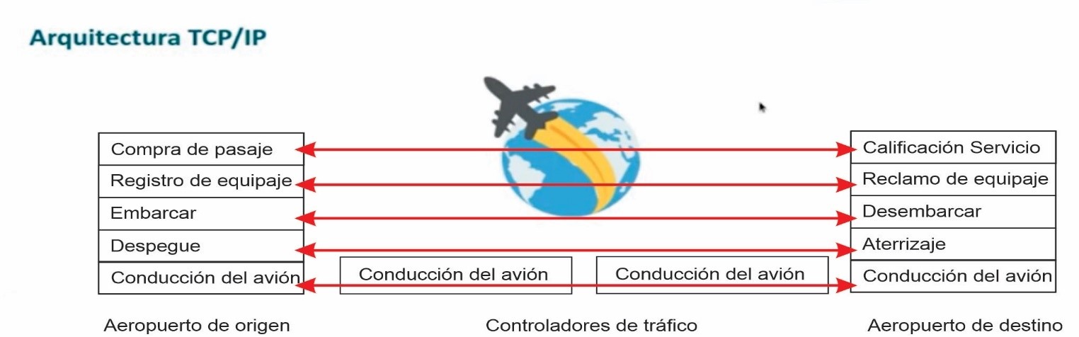 Ahora vamos a revisar conceptos de arquitectura TCP/IP. Para explicar el concepto arquitectura TCP/IP, vamos a utilizar esta la analogía del proceso que ocurre en un transporte aéreo.