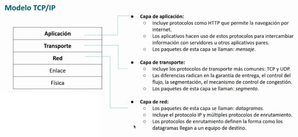 Para eso tenemos dos protocolos en este caso hay muchos más, pero los más importantes son: protocolo TCP y el protocolo UDP. Cada uno de ellos tiene unas funcionalidades especiales y unas diferencias, de manera general, lo vamos a ver más adelante, pero de manera general, el protocolo TCP permite que la comunicación sea fiable porque garantiza que el destinatario reciba el mensaje que está enviando el emisor el protocolo UDP no, el protocolo UDP simplemente envía, pero no garantiza la recepción del mensaje. Las diferencias entre ambos, como lo hemos mencionado, pues están en la garantía de entrega del mensaje y el control de la cogestión, segmentación mecanismos de controles también son diferentes en ambos casos y en la capa de transporte pues ya le vamos a llamar, en este caso, la unidad la vamos a llamar segmento Vamos ahora con la capa de red, la capa red es la tercera y en este caso primero que todo, a las unidades de datos en la capa de red le vamos a llamar datagramas y en la capa de red también existen muchos protocolos, pero principalmente el más importantes es el protocolo IP, el protocolo IP es el más importante. Es el protocolo que permite la comunicación de un origen a un destino, en este caso los mensajes se van a encapsular en segmentos, los segmentos se van a encapsular en datagramas, datagramas IP en este caso porque pues asumimos que estamos utilizando el protocolo IP. En la capa de red también hay algo muy importante y es que se implementan diferentes protocolos de enrutamiento, los protocolos de enrutamiento permiten justamente que un equipo envíe datos hacia un equipo, un equipo a envía datos hacia un equipo b y hay muchos elementos intermedios, muchos elementos intermedios y también posibles rutas que permiten que el mensaje llegue de A a B, entonces esos elementos intermedios se rigen por unos protocolos de enrutamiento que garantiza que el mensaje pues tomen la ruta más adecuada, que se vaya por la ruta más adecuada, por ejemplo, aquella que le permita garantizar un ancho de banda o un throughput óptimo para el tipo de aplicación que se está usando de un origen a un destino.