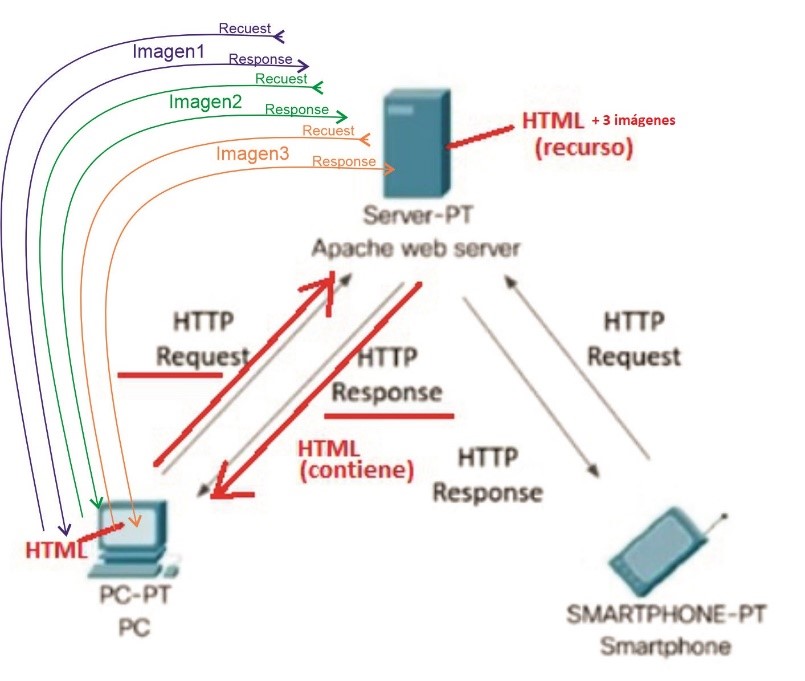 Pero qué sucede si es HTML tiene a su vez por ejemplo tres imágenes, dentro del HTML hay tres fotos por ejemplo, yo tengo que primero hacer la petición para traer el HTML, pero para poder cargar cada una estas imágenes también tengo que hacer peticiones adicionales, es decir, tendría que hacer una nueva petición para poder traer un nuevo HTTP request para poder traer la imagen número uno con respectiva respuesta, una petición para traer la imagen número dos y finalmente una tercera petición para traer la imagen número tres. Entonces no necesariamente para traer un recurso una página web por ejemplo de un web server solamente se necesita una petición, dependiendo si el HTML tiene objetos que necesito ir a traer, pues voy a tener que hacer nuevas peticiones HTTP request para poder traer todos esos recursos que están componiendo el recurso HTML que acabo de obtener.
