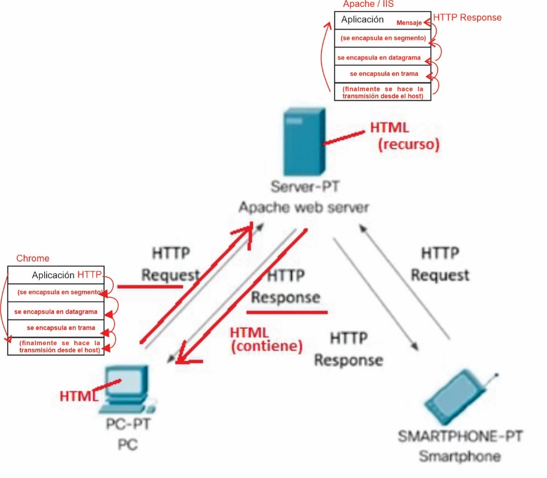 Ahora, hay aplicaciones dentro del PC que hacen uso de ese protocolo HTTP por ejemplo Google Chrome. Google Chrome es la aplicación que hace uso de ese protocolo HTTP para poder hacer las solicitudes hacia un servidor de destino y en el caso por ejemplo acá de ese servidor de destino estaría por ejemplo Apache web server (o podría estar por ejemplo Internet Information server que es otro web server) y ellos hacen uso también de ese protocolo HTTP para poder recibir las peticiones y para también enviar las respectivas respuestas.
