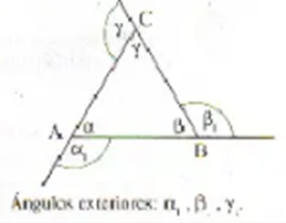 Ángulos exteriores: con los ángulos formados por un lado del triángulo y la prolongación de otro hacia la región exterior.Se nombran generalmente por la letra del ángulo interior adyacente con un subíndice.